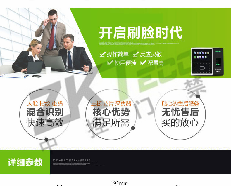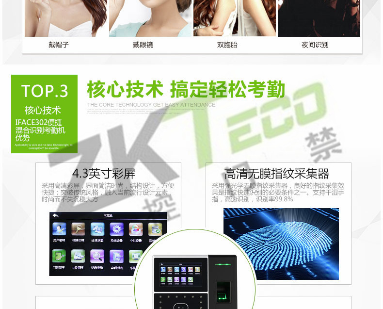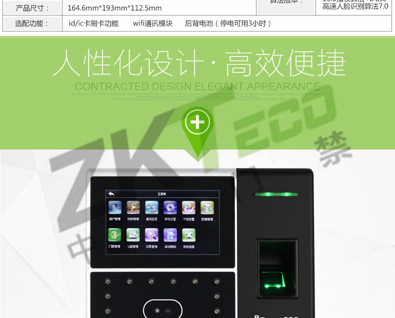 該產品采用了中控科技最新的ZEM600核心板,ZKFinger10.0指紋面部混合識別算法,容量大,識別速度快,集成高分辨率夜視紅外和彩色雙攝像頭功能,適用范圍廣,不受外界光線的影響,無論是在強光下還是在黑暗中也能進行有效識別。該系列已經通過了超過10萬面部數據庫長達2年的測試,同時該算法也在美國San Jose大學年度測試中名列前矛,在用戶舒適度方面獲得了最佳評分。iFace采用了嵌入式中控Multi-Bio CPU,主頻為630MHZ,可以處理高達1:20000的1:N速度,符合人體工程學的外觀設計,工業設計由德國專業公司主導完成,模具采用了PC材料+蝕紋工藝+鏡面工藝,采集比對就如照鏡子一般,支持4.3寸全觸摸TFT,僅有6個狀態功能鍵,其它按鍵在TFT上全觸摸操作。標配TCP/IP通訊方式,支持跨網段跨網關連接。