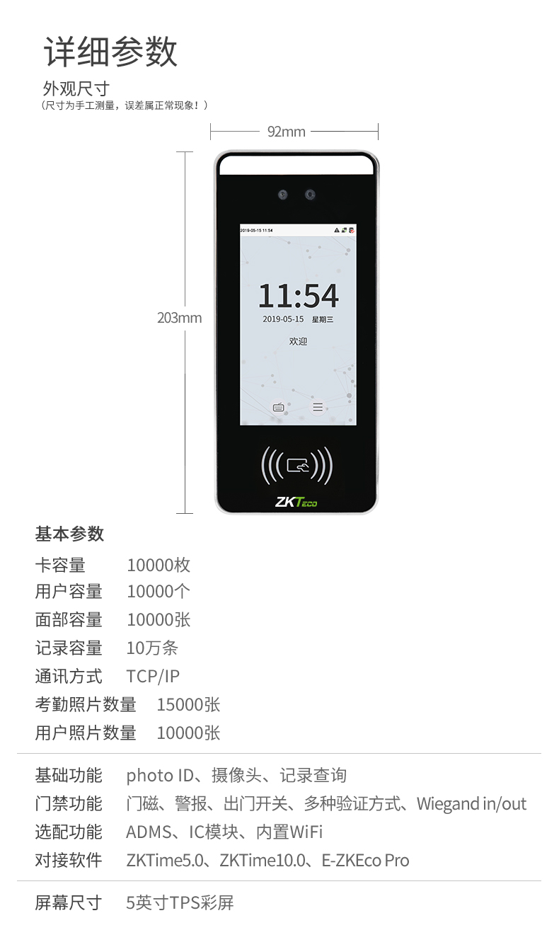中控xface60非接觸式刷卡門禁是中控智慧根據市場需求,全新推出的多光譜智能考勤機,區別于以往的人臉靜態識別,具有快速讀取、動態識別的功能。xFace60采用Linux操作系統,具有刷卡認證、人臉識別等驗證方式,簽到多種選擇,輕松考勤;中英文輸入法,輕松編寫。標配Wiegand in/out,具有門磁、報警等多種功能,守護您工作安全。